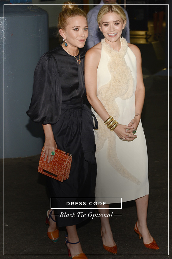 Khi nhận được thiếp mời cùng dresscode này, các đấng mày râu có thể lựa chọn trang phục tuxedo và nơ bướm. Còn với các nàng thì phức tạp hơn một chút, thông thường là váy dài hoặc một bộ đầm cocktail trang trọng (những mẫu đầm ôm sát ngực với chiều dài ngang hoặc trên đầu gối).